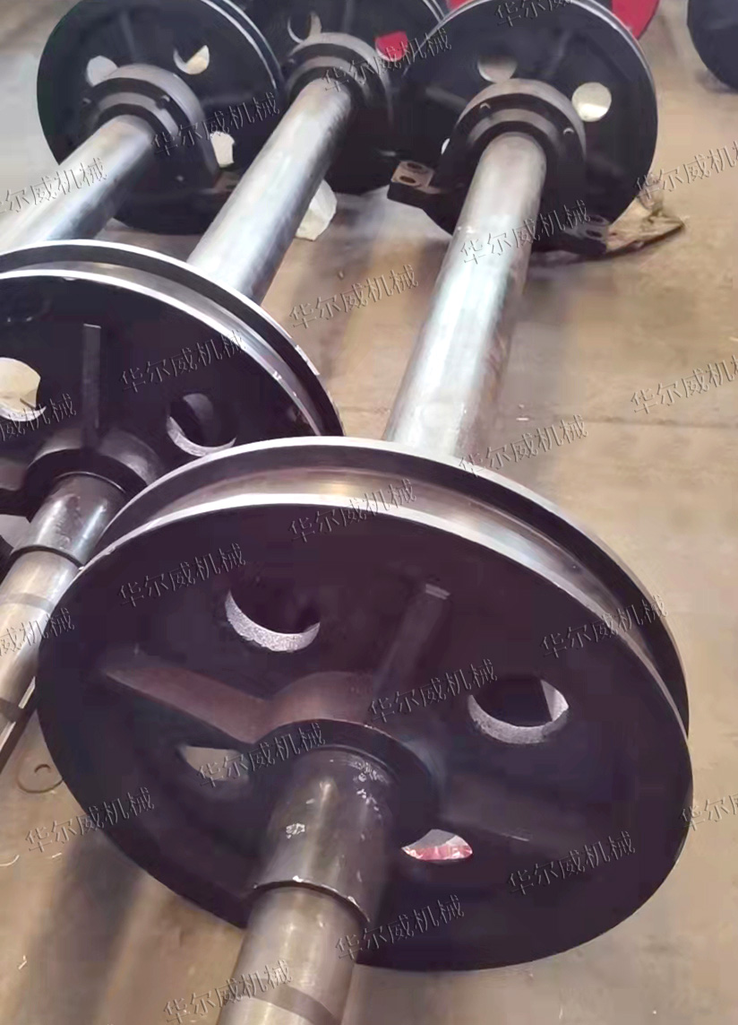卸料車行走輪通常由車輪、軸、軸承座、密封件等共同組成。卸料車行走機構是由4個車輪及兩根通軸組成的兩個車輪對。卸料車行走輪為鑄鋼件,表面淬火處理。車輪內側或兩側的輪緣與鋼軌之間有一定的間隙,能保證車輪與軌道之間不出現啃軌現象。